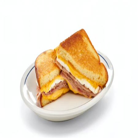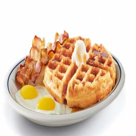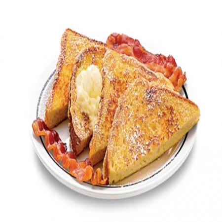 Made with a splash or buttermilk & wheat pancake batter! Served with choice of three buttermilk pancakes, hash browns, buttered toast, three flavored pancakes from pancakes section, or fresh fruit.